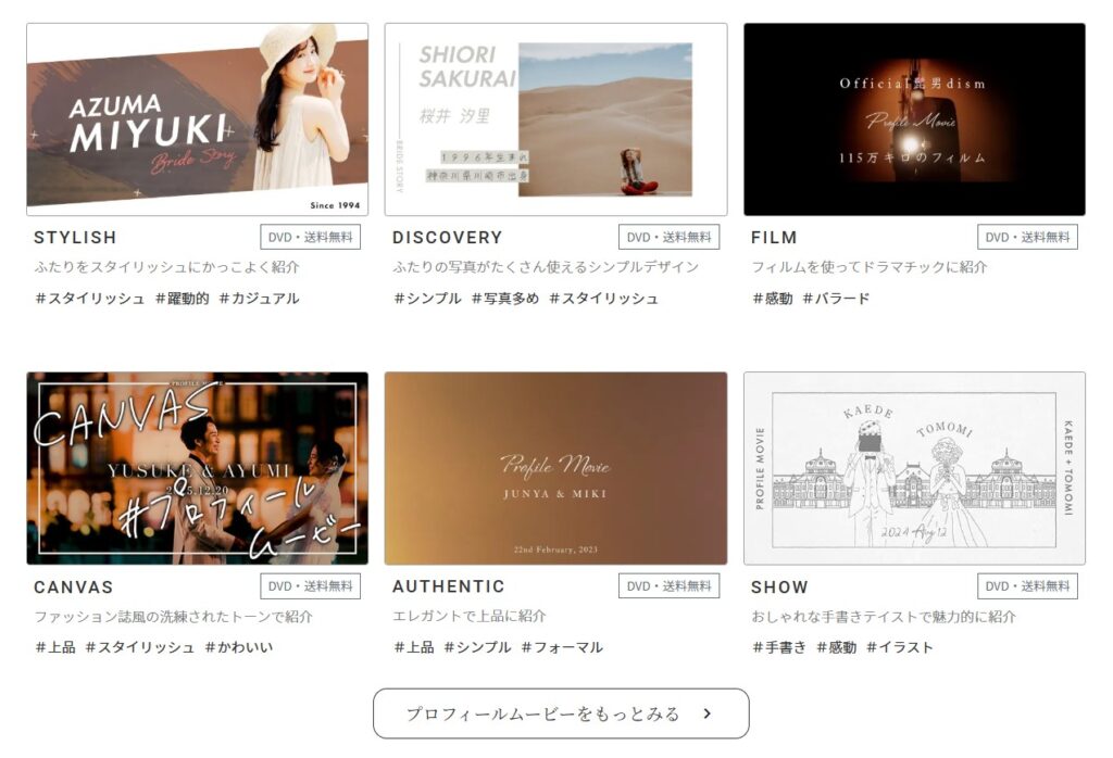 全部で9種類あるプロフィールムービーはどれもおしゃれでとても洗練されたデザインです。